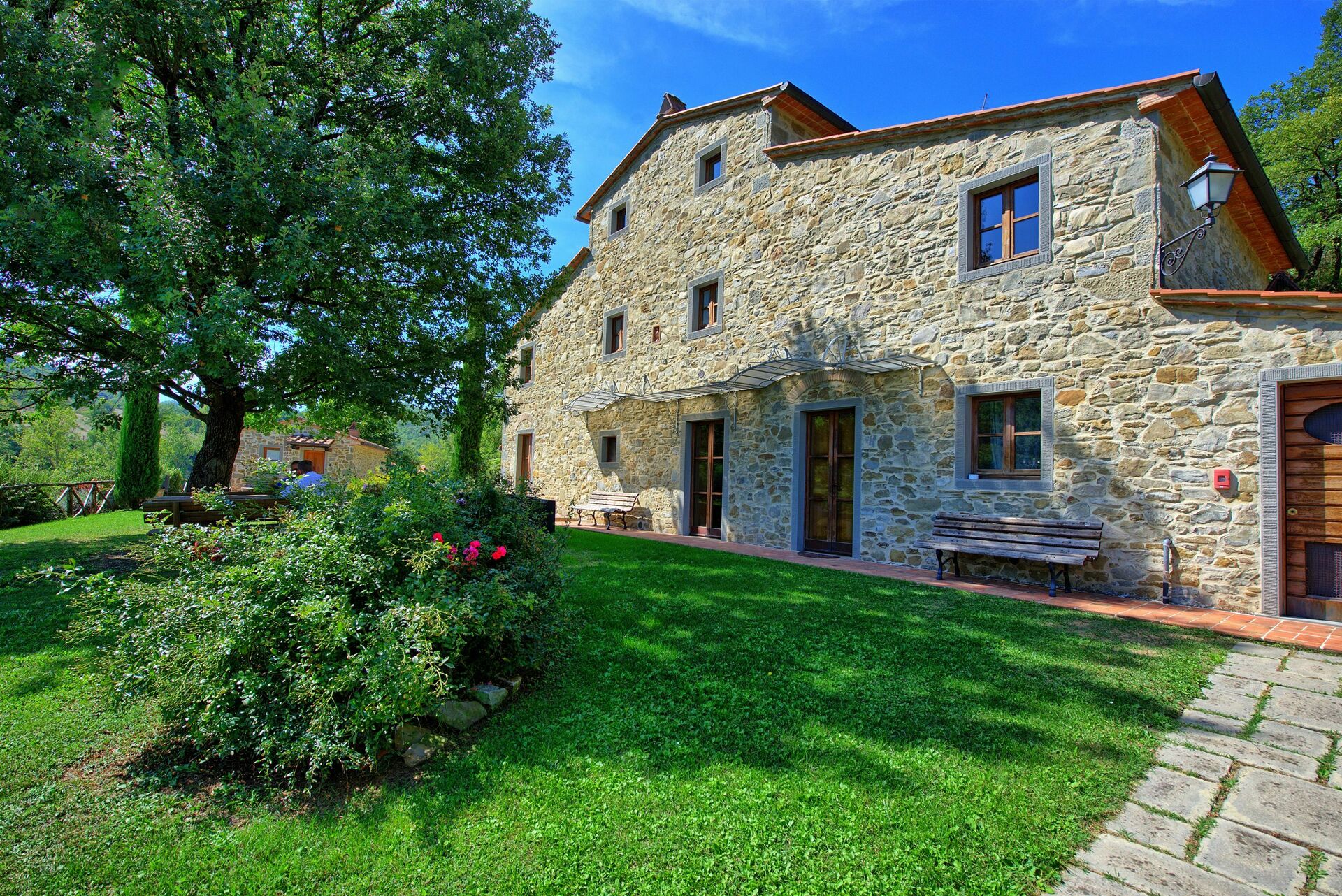Prachtig boerenhuis liggend in het heuvelland in de omgeving van Arezzo ( afstand slechts 18 km). Het huis is compleet gerestaureerd en veranderd in een zeer comfortabel verblijf dat 16/20 personen kan huisvesten. Het eigendom is bestaat uit een hoofdverblijf en uit twee voormalige hooischuren die onderverdeeld zijn in appartementen, teneinde de gasten een maximale privacy te bieden en tegelijkertijd samen de grote zaal met keukenhoek op de begane grond te gebruiken om met elkaar de kunnen koken en de maaltijd te gebruiken. Het interieur is mooi gemeubileerd in een rustieke stijl. Buiten hebben de gasten de beschikking over een omheinde tuin, een privé zwembad met zonneterras een mooie barbecue ruimte met een grote gemeubileerde gazebo, tafels en stoelen.